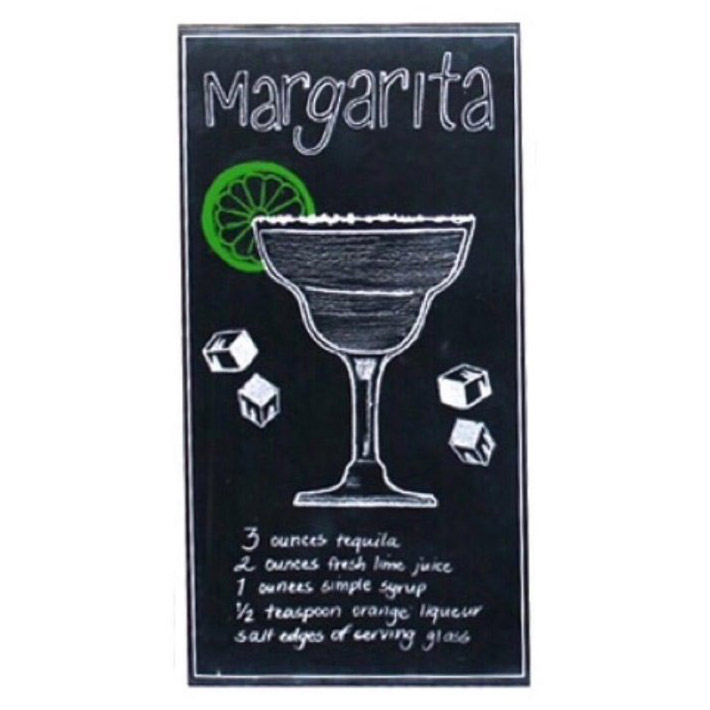 Stylish metal wall sign with a Margarita glass on it. The finish is reminiscent of a blackboard, and in addition to Margaritan, the recipe is also written. Nice sign to have in the home bar, living room or in a cocktail bar.