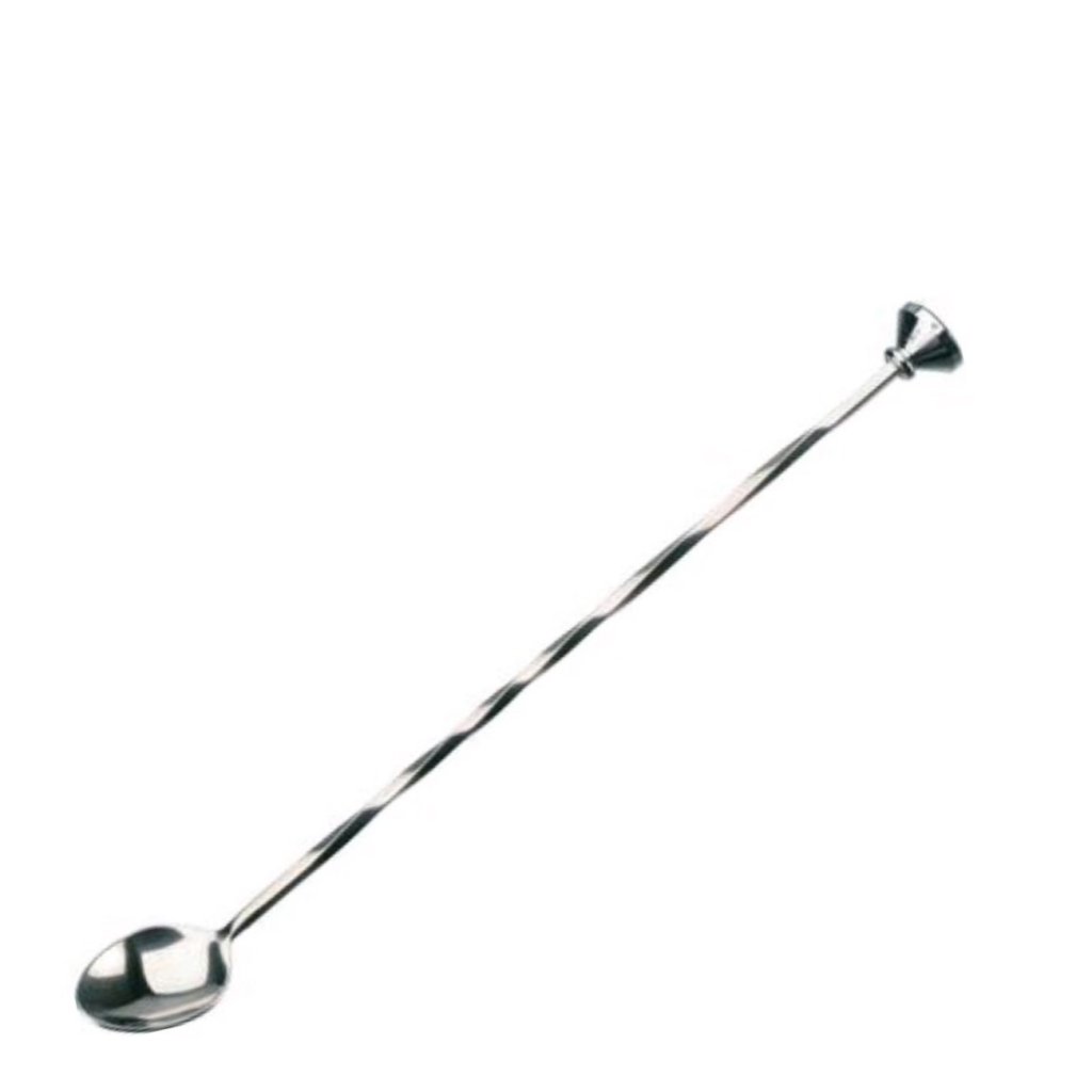 Bar spoon with Muddler. This bar spoon has screwed handles to be able to layer liquids. A muddler is placed at the top of the spoon.