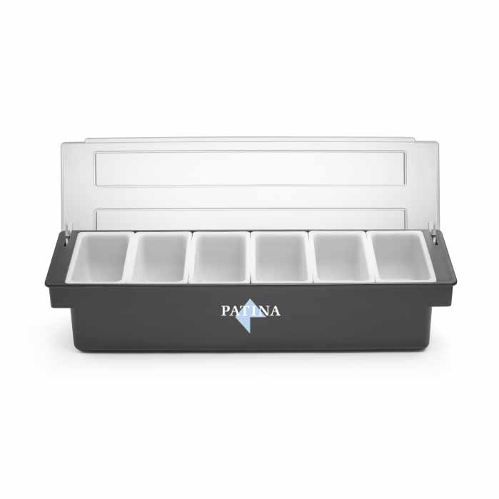 Cocktail dispenser Patina. An excellent 'mise en place' storage for drink ingredients. This model has six compartments and a plastic lid.