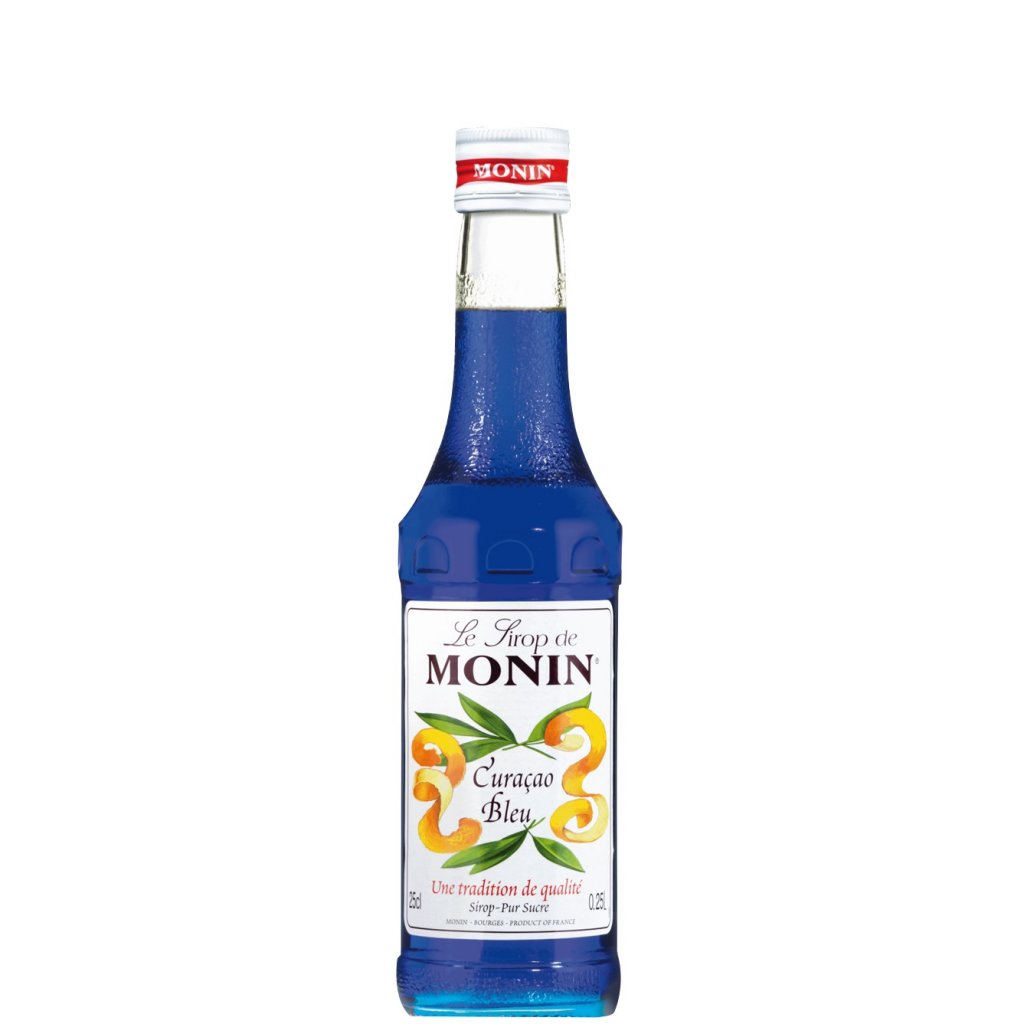 Monin blue curacao. An exotic team with a Caribbean blue color. Blue Curaçao gives your drinks and cocktails a beautiful deep blue color and contributes to its flavoring of orange peel with a fresh citrus freshness and light bitterness. Excellent to use when layering drinks.