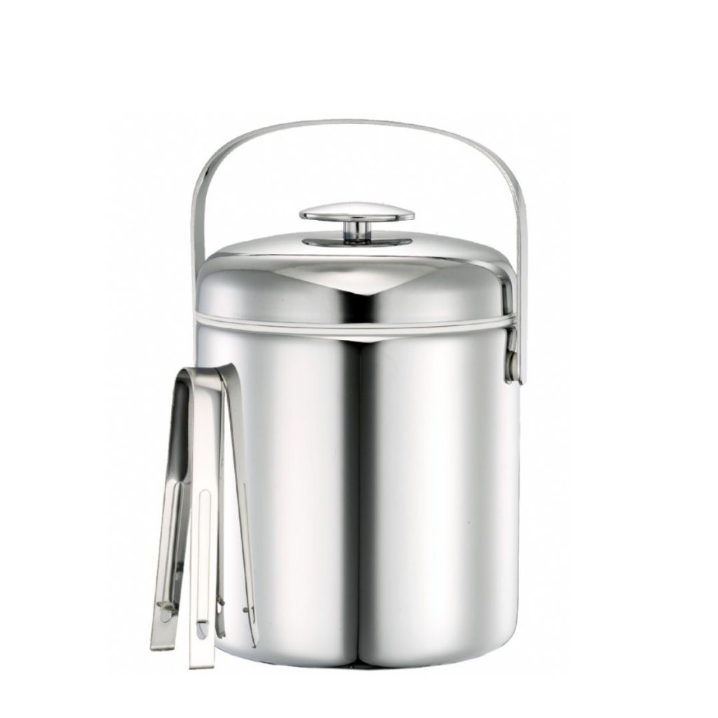 Ice bucket with lid and ice tongs. This chrome ice bucket has a flexible lid that retains the cold better. The associated ice bar is easy to handle and a grip-friendly handle makes it easy to move.