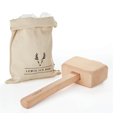 Wooden hammer with associated ice bag for ice crusher. A coarse wooden hammer which with its relative softness works excellently to crush ice.