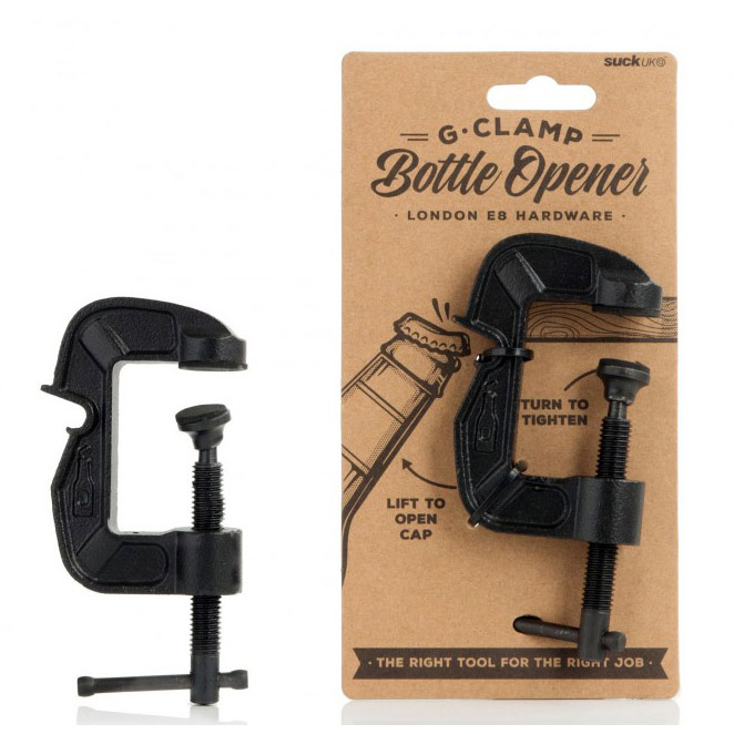Cap opener G-clamp. A tool that does the job. A classic G-clamp with a smart function that is perfect for all thirsty craftsmen!