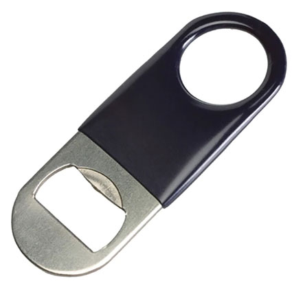 Mini Bar Blade can opener black. One of the most common can openers in a restaurant environment. A flat disc with an opener at one end and a hole in the other. The hole is there to be able to easily pick up bottles from ice. Mini Bar Blade is available in a variety of colors.