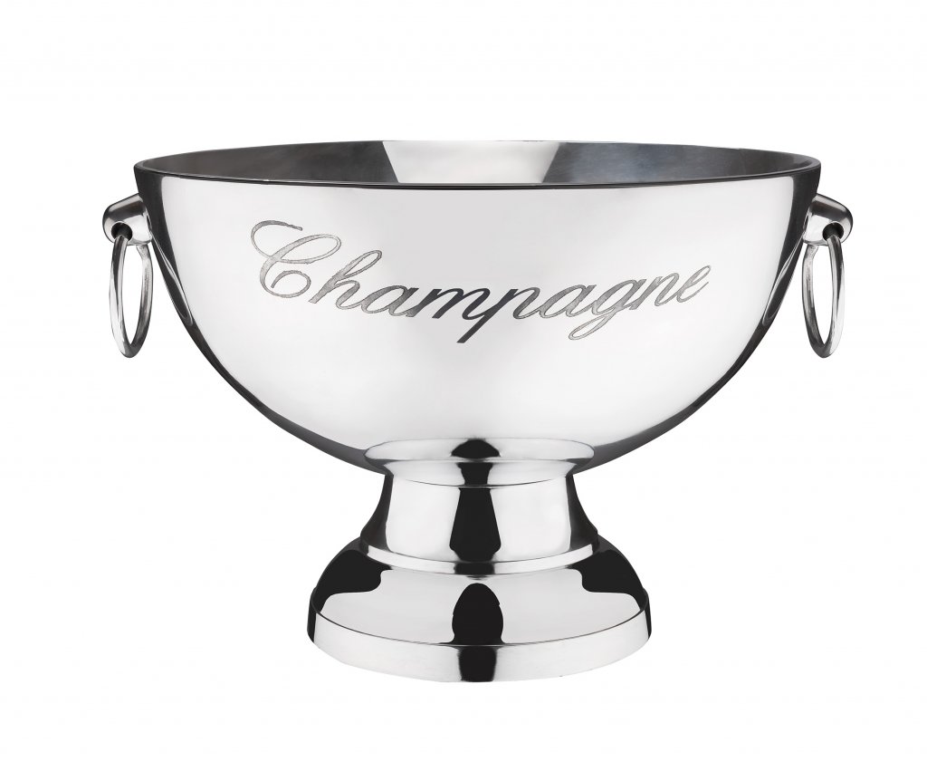 Large champagne cooler from Dorre. An elegant high-gloss champagne cooler in durable aluminum. The champagne cooler has a body that rests on the foot with two rings as handles. A decorative text with Champagne is engraved on the body.