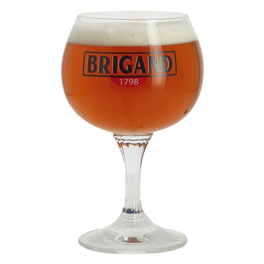 Brigand beer glass with the brewery's logo printed on the side with blue text. Brigand beer glass has a ribbed foot and is of the highest quality and created by the Van Honsebrouck brewery from Belgium. The glass contains 33 cl and is the best way to enjoy this fantastic beer. These products are also very popular gifts for both yourself or others.