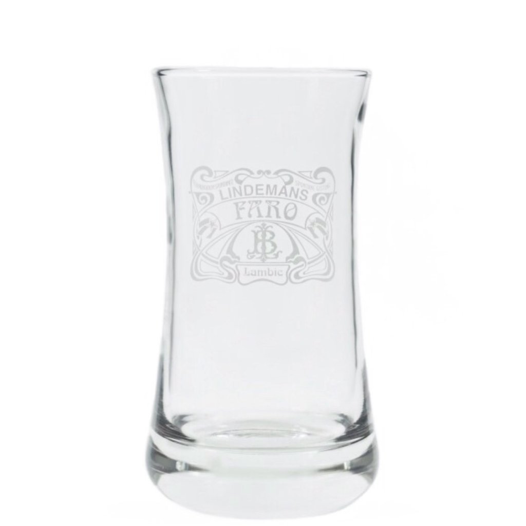 Lindemans Faro beer glass. A classic style of spontaneous yeast beer. Faro is the name of Lambic which is sweetened with brown sugar, after which the drink gets a wonderful amber color and a balanced sweetness / acidity. This beer glass is of the type traditionally used for Faro and Gueuze. A relatively low glass with a stable bottom. This model has a pleasant sway that aesthetically goes very well with Lindeman's logo, which is printed on the front of the glass.