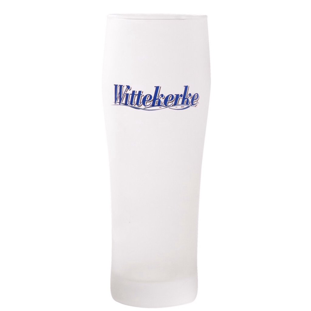 Wittekerke beer glass. An authentic Belgian Witbier from the brewery Brasserie Bavik- De Brabandere. This light, healthy, slightly spicy wheat beer of course has its original glass to enjoy. Wittekerkes beer glass is shaped like a typical wheat beer glass with a slightly thicker bottom. The entire Witekerke beer glass is frosted, which gives a fresh impression. The Wittekerke logo is printed on the front of the glass.