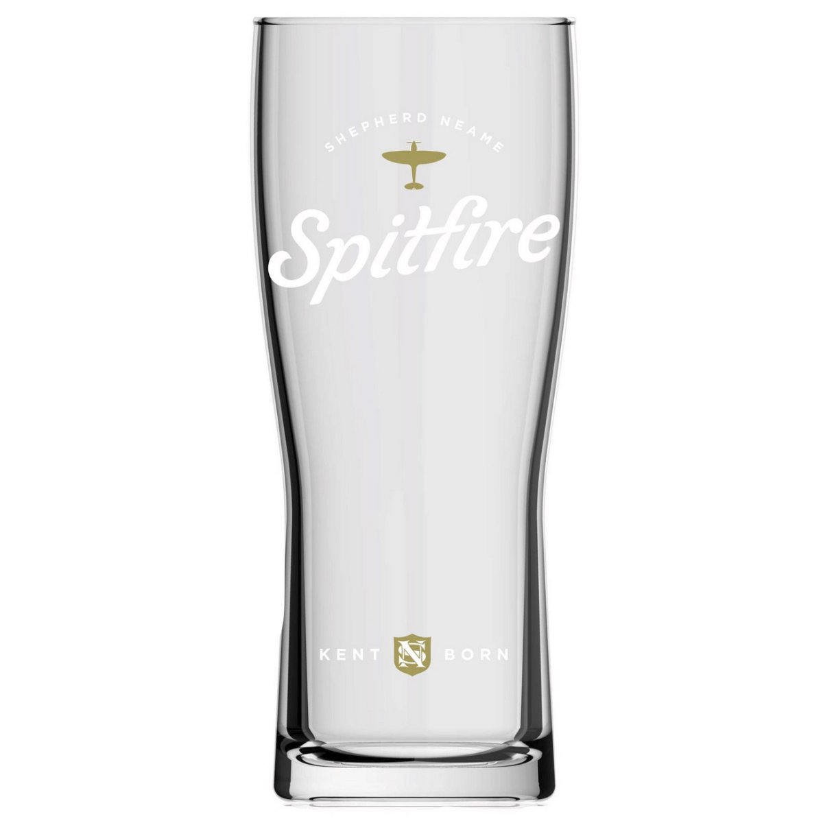 Spitfire beer glass. A British classic named after the famous fighter. Shepherd's Neame Spitfire Ale is a classic British Bitter. This beer glass has a deliciously high body and is both pleasant to drink and easy to grip. On the front, the Spitfire logo has been frosted along with the silhouette of the famous aircraft and the text Shepherds Neame written in frost. Marking for 1 pint is printed on the back.