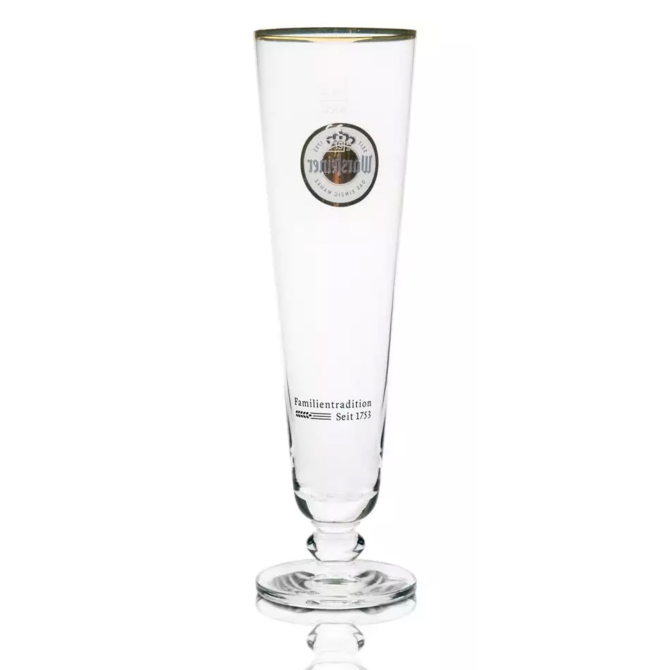 The glass has a gold edge at the top and is provided with a delicious print with the Warsteiner logo.