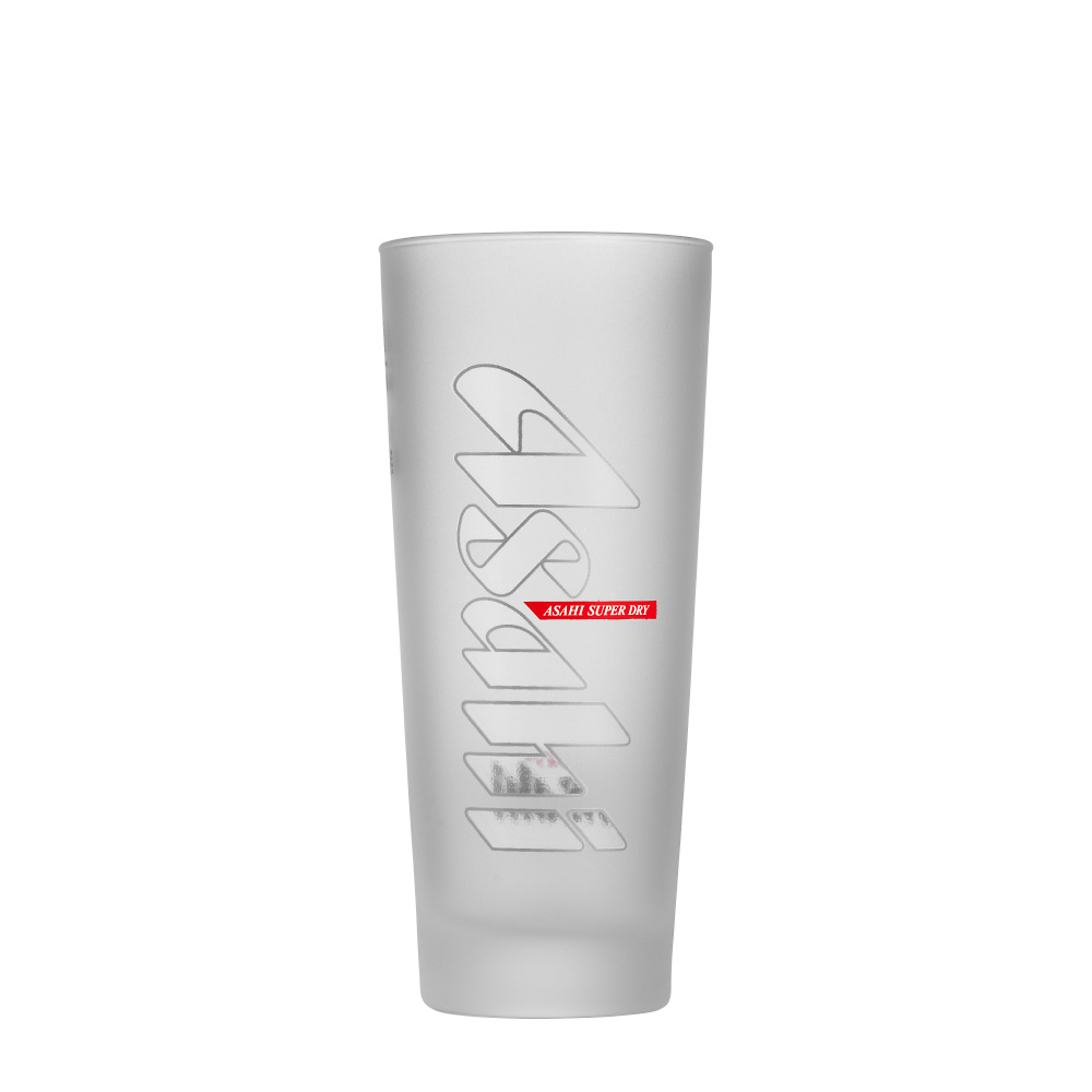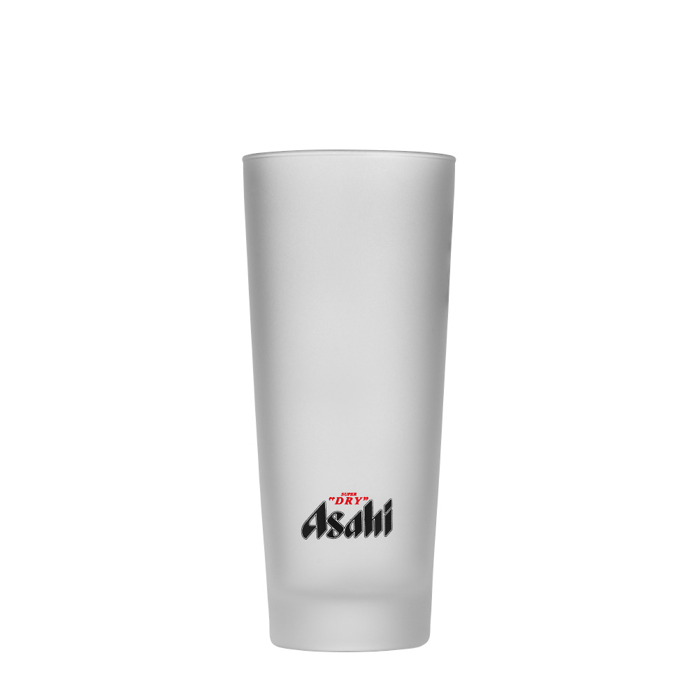Asahi frosted beer glass 25 cl. A perfect glass if you want to enjoy a small Japanese Asahi beer! The glass is straight and slightly widening towards the top. Asahi's logo is located vertically along one side of the glass and on the other side is a small logo along the lower edge.