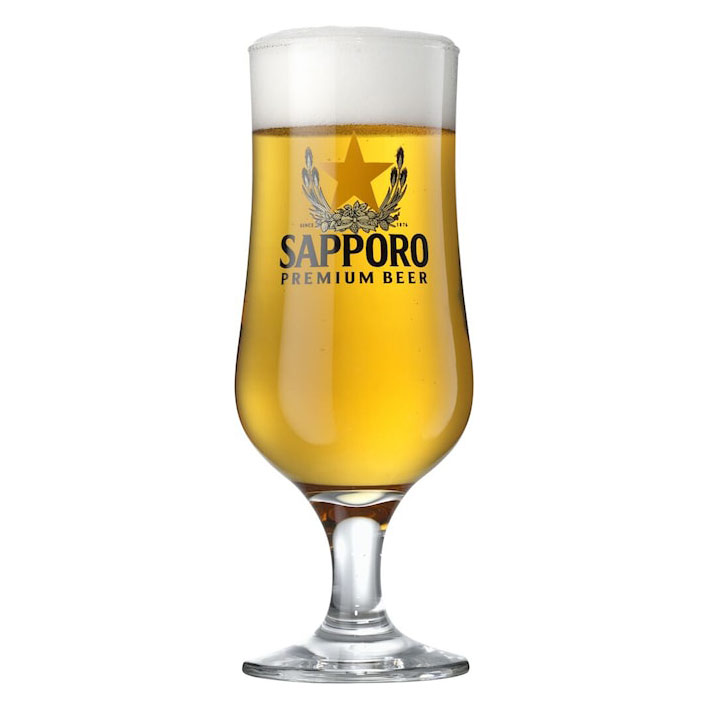 Sapporo beer glass 37 cl on foot. The oldest registered brewery in Japan. Despite its name, the Sapporo Brewery is located in Tokyo. This beer glass has a really nice cup with a stable stem and wide foot. The Sapporo logo is printed on the front.