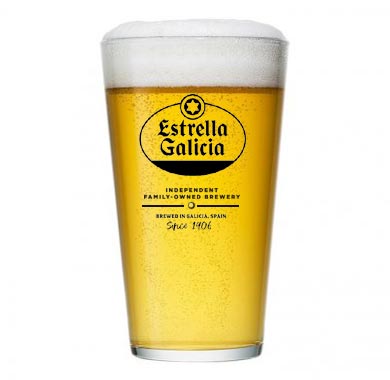 This stylish beer glass, with beautifully balanced proportions, highlights the perfect beer experience. The glass is adorned with Estrella Galicia's iconic logo on the front, giving it an extra touch of class.