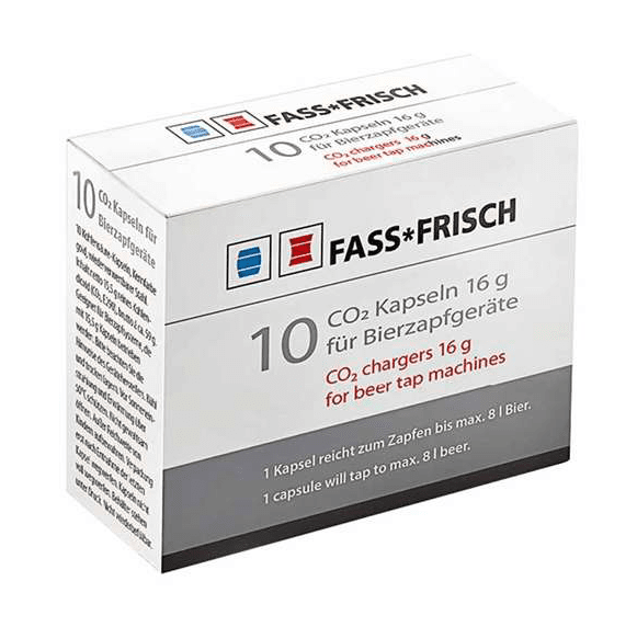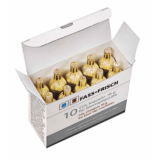 Carbon dioxide cartridges CO2 16 gram uKeg 10-pack suitable for use with uKeg Growler bottling keg. Each cartridge contains 16 grams of carbon dioxide.