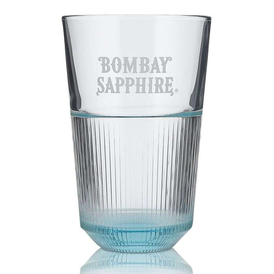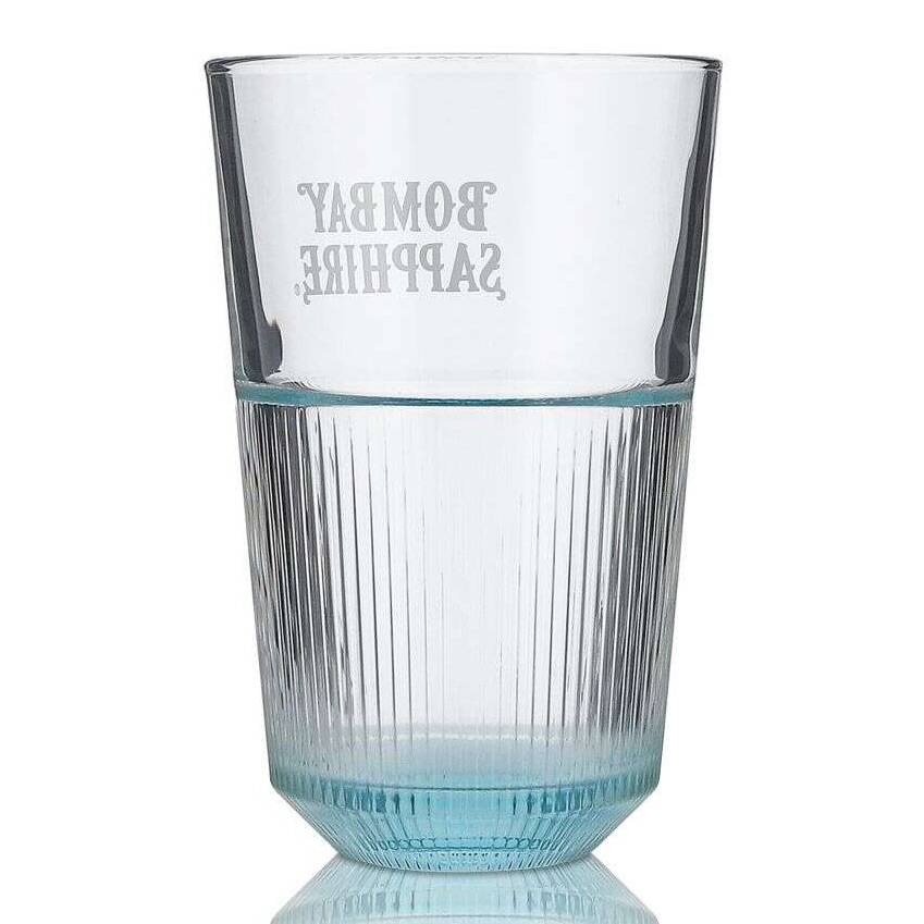 Bombay Sapphire highball glass, perfect for mixing and serving a classic Gin & Tonic with a timeless, elegant feel. This drink glass features a stylish ribbed contour along the base that transitions into a rounded shape.