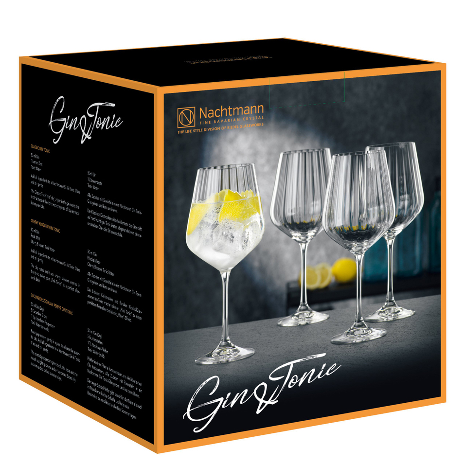 Nachtmann Gin and Tonic glass 4-pack. Handsome glass from Nachtmann that impresses with its extravagant look. The 24 vertically blown lines that run along the cup create a beautiful silhouette.