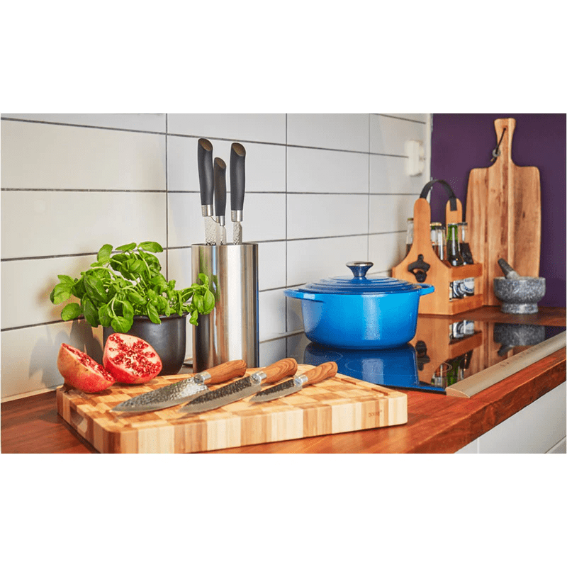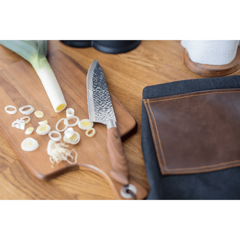 The knife blades are made of hammered steel with a very sharp knife edge.
