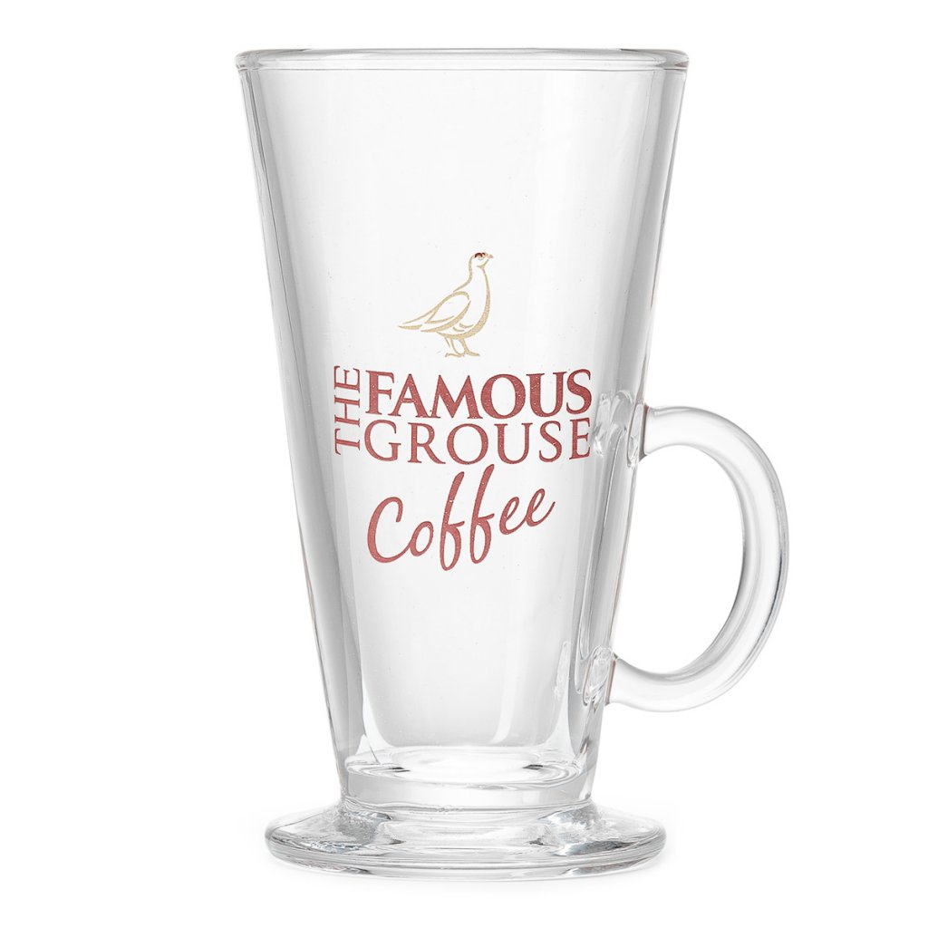 The glass has the Famous Grouse logo printed on the side and the word "Coffee" in a stylish design.