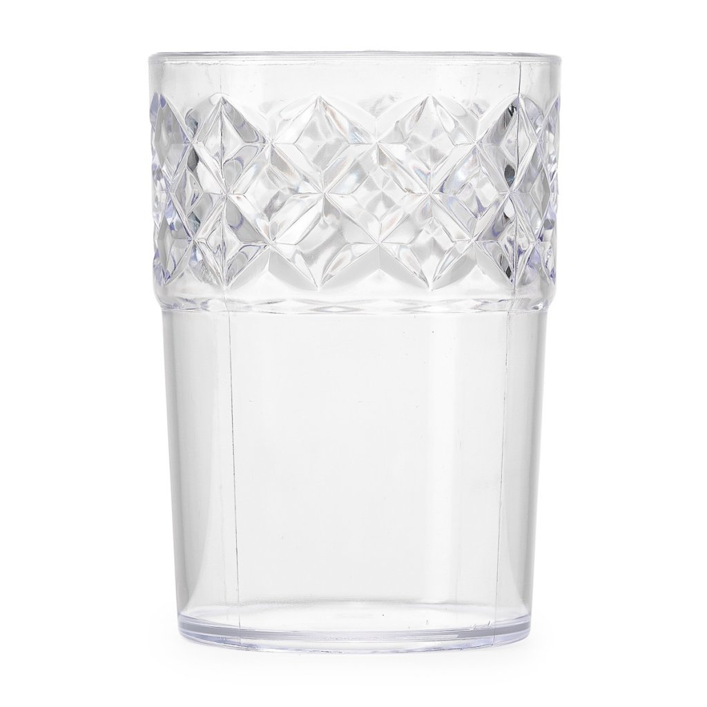 Plastic glass crystal clear 35 cl in retro design with cut plastic in the upper part that resembles diamonds. A really nice glass to serve any drink from.