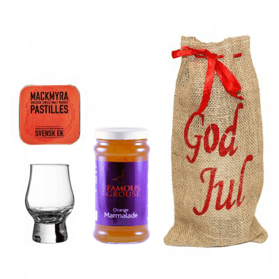 Christmas bag in sackcloth with red ribbon containing a Perfect Dram whiskey glass, a Whiskey marmalade Famous Grouse, pastilles from Mackmyra. A perfect gift package, already wrapped in the Christmas bag. Very suitable Christmas present for anyone who loves whiskey with tasty snacks.
