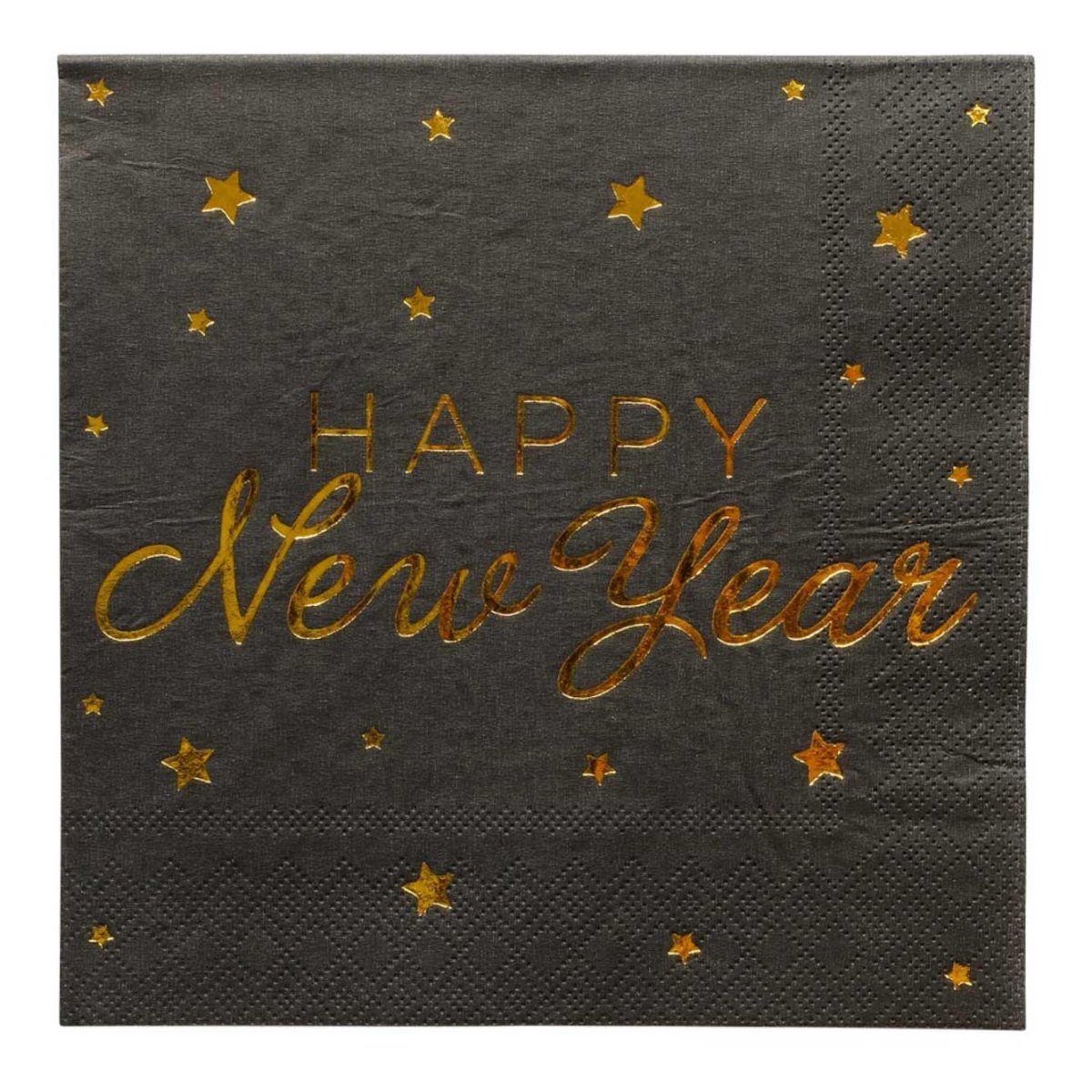 The napkins feature golden details with the text "Happy New Year" and are made from high-quality material that is both soft and durable. They are also large enough to be comfortable for you and your guests to use.