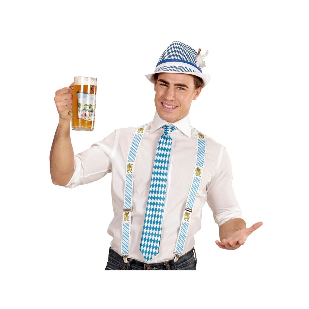 Oktoberfest tie with the traditional Oktoberfest pattern in white and blue to be tied around the neck before the world's largest party. Combine this tie with other attire for the October party.