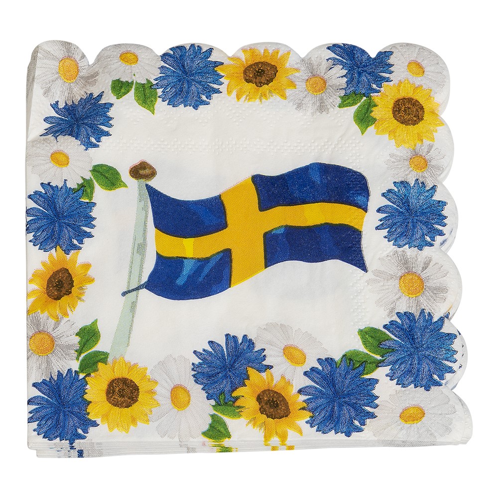 Napkins Student 16-pack. Sing about the student's happy days! And by all means do not forget the napkins for the champagne breakfast, as you know it can get messy. Champagne spilled, tears of joy to be dried. These nice napkins have a design with the Swedish flag and mixed midsummer flowers, fresh napkins to set the table with.