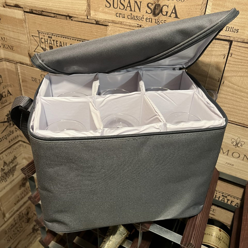 Gray red transport bag for 6 glasses or bottles with padded walls for safe transport. Now you can easily pack down your glasses and transport them safely to the wine tasting, etc.